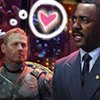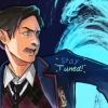 Description: Tom Payne in a dark coat tugging on a thin scarf or tie around his neck